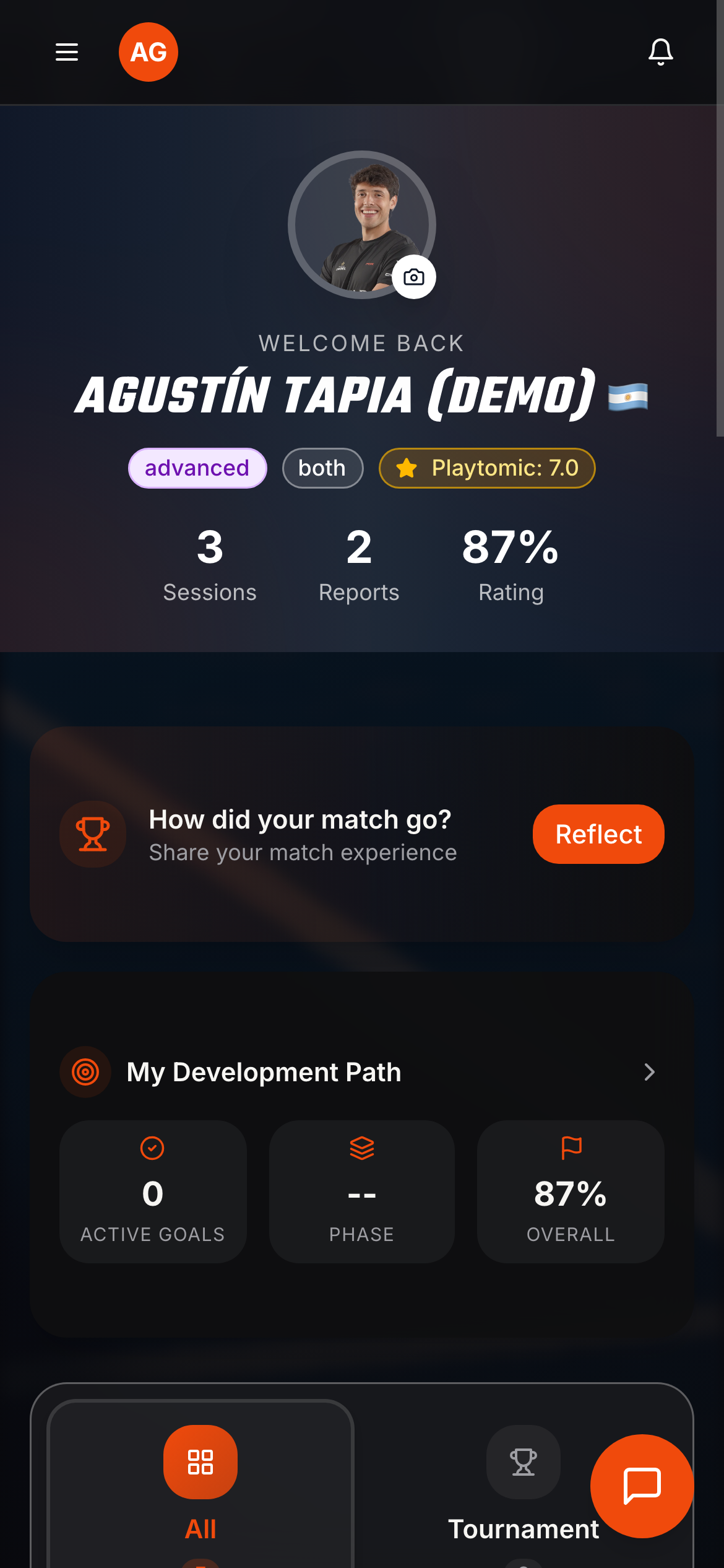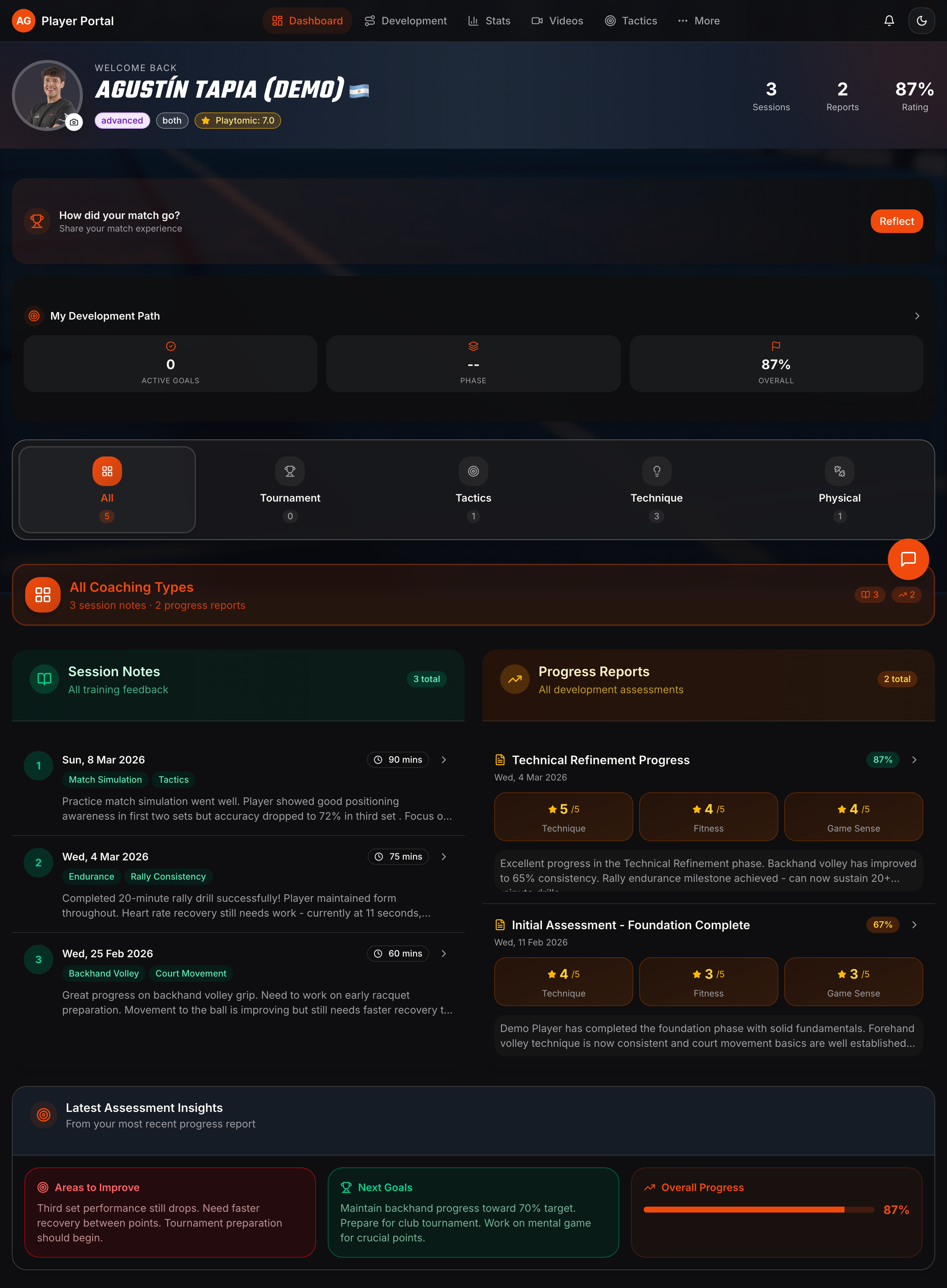 Session notes, progress reports, development path and match reflections — all in one place.